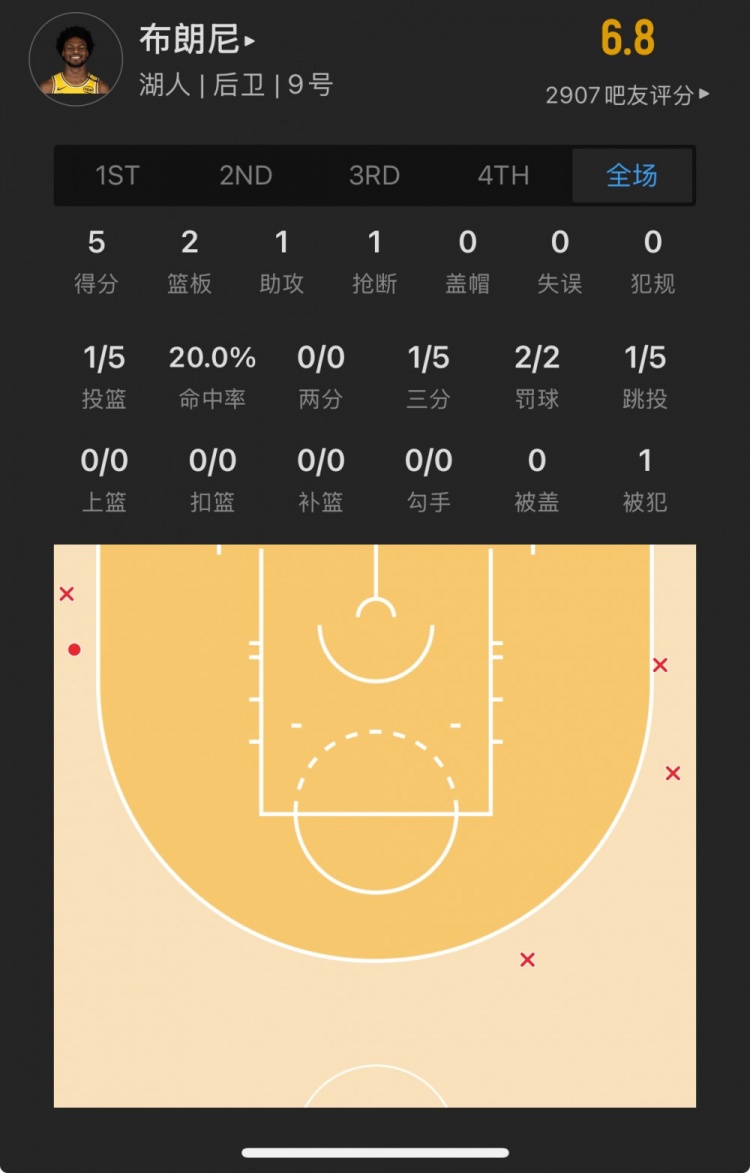 湖人55号秀 布朗尼-詹姆斯 登场15.7分钟