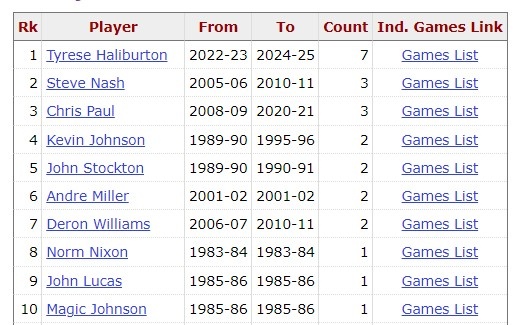 根据数据统计,这是哈利伯顿生涯第8次打出单场至少20分15助并且0失误的比赛,他在这一榜单上高居历史第1。