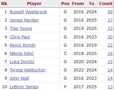 威少过去10个赛季50次半场助攻上双 同期最多 哈登37次第二