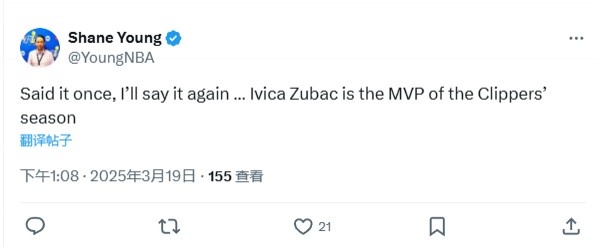 对此,美记Shane Young发推写道:“再说一次,我还会继续说——祖巴茨就是快船本赛季的MVP!”