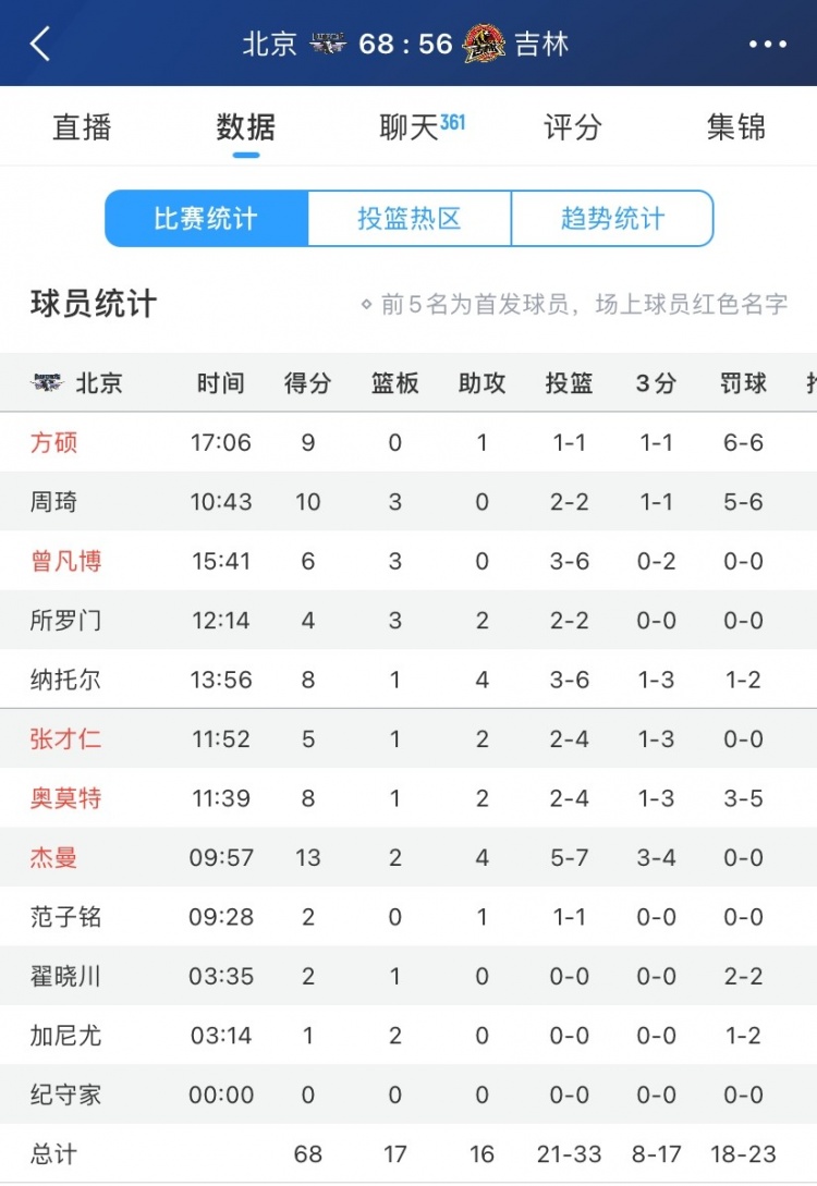 全民皆兵!北京半场11人出场轮换皆有得分入账 周琦10分&杰曼13分