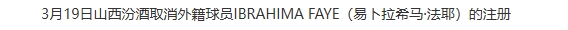 迪亚洛在3月15日对阵青岛男篮的比赛吃到技术犯规,累计9T自动停赛一场。3月17日,山西取消注册迪亚洛,注册回法耶,法耶出战了对阵福建男篮的比赛。
