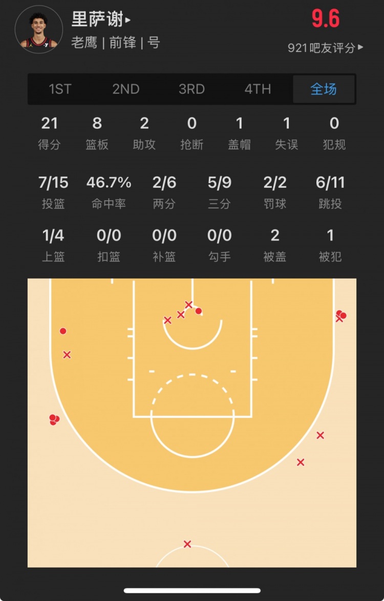 老鹰状元秀 扎卡里-里萨谢 登场23.6分钟