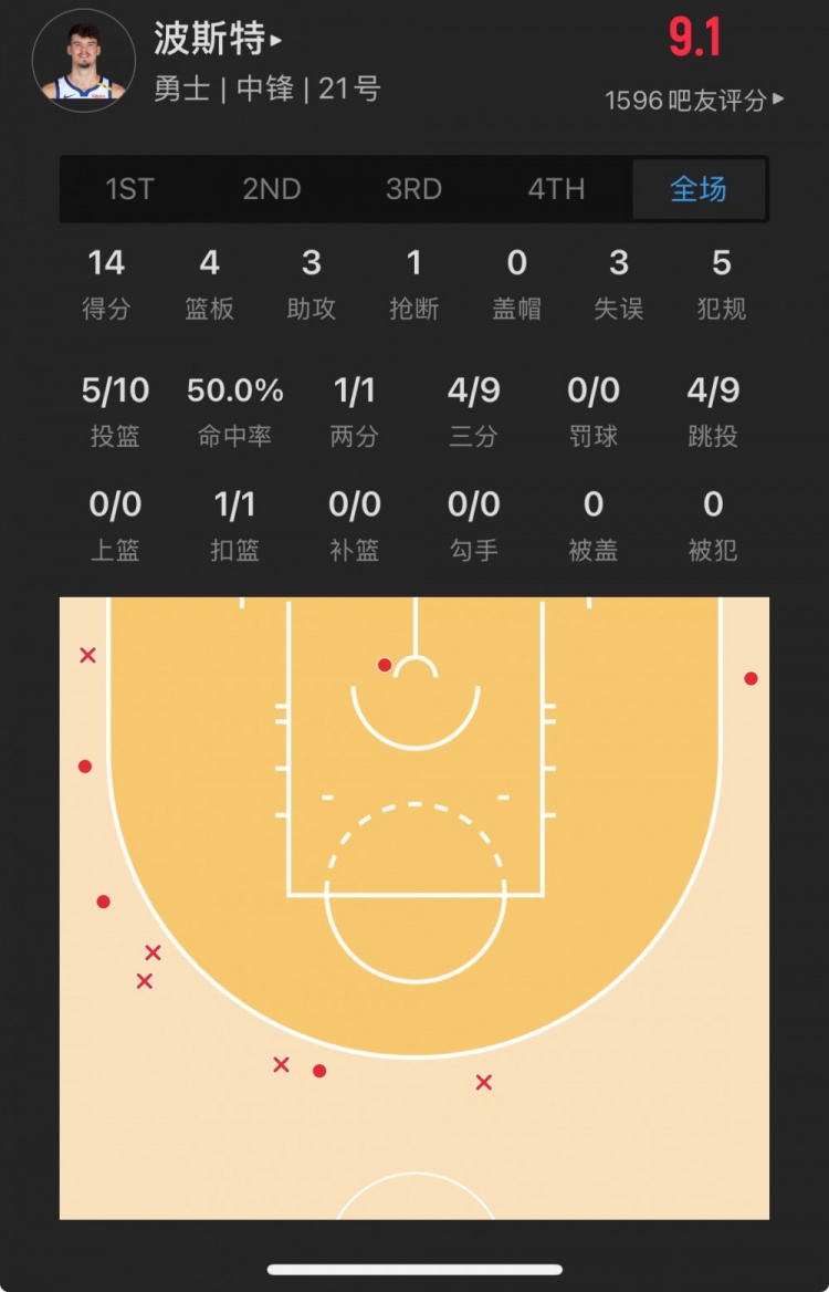 勇士52号秀 昆滕-波斯特 登场23.1分钟