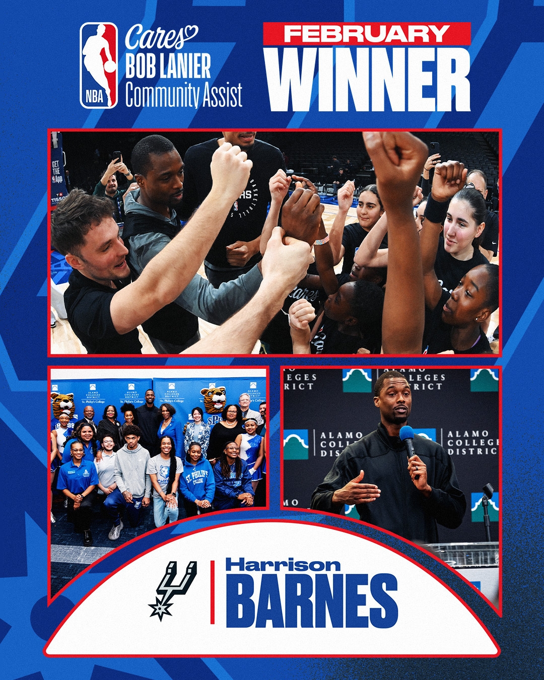 圣安东尼奥马刺队前锋哈里森-巴恩斯被评为2月份的NBA“鲍勃-兰尼尔”社区关怀援助奖(Bob Lanier Community Assist Award)得主。巴恩斯和他的妻子布列塔尼向阿拉莫承诺项目(AlamoPROMISE)捐赠了25万美元,该项目为符合条件的贝萨县学生支付学费和杂费。