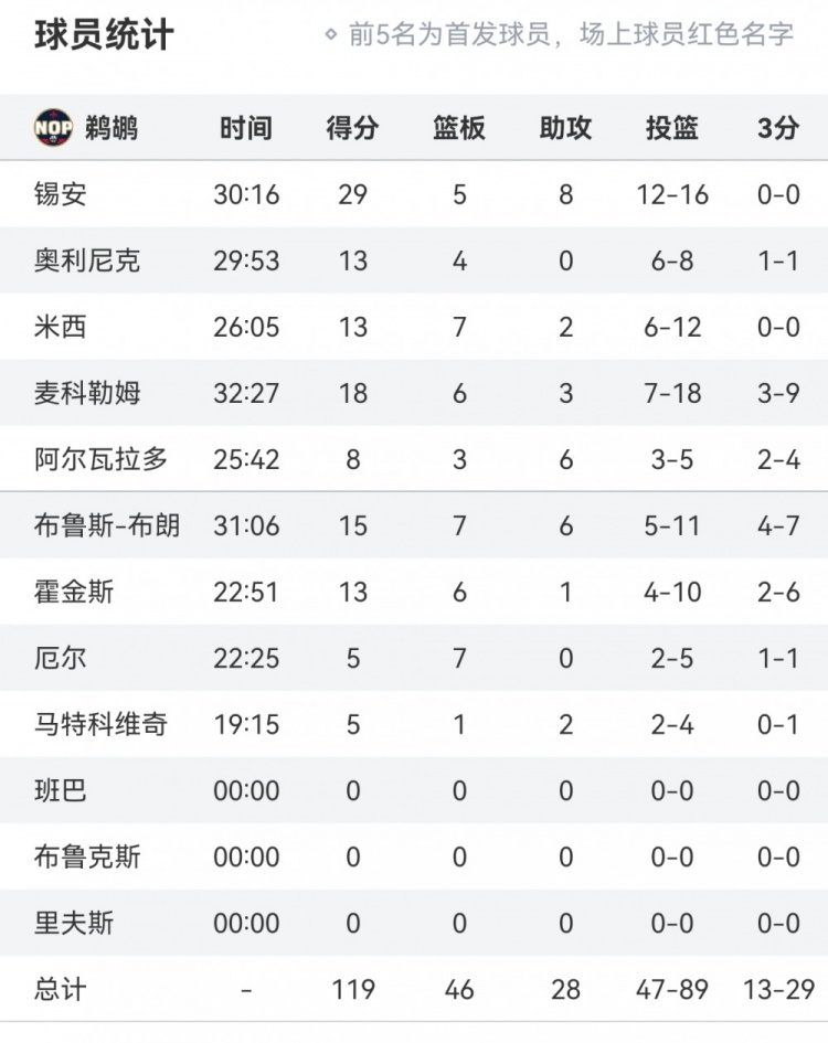 本场比赛,鹈鹕全队多点开花,共6人得分上双。具体如下: