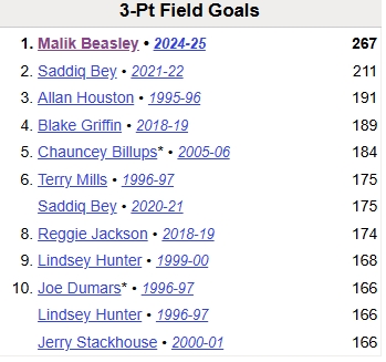 以上为本场赛前活塞队史单赛季三分命中数前十