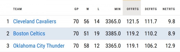 到目前为止,雷霆的进攻效率为119.1(每百回合得分),高居联盟第三,仅次于骑士和凯尔特人;防守效率为106.2(每百回合失分),高居联盟第一;净效率12.9(每百回合净胜分)也是联盟第一。
