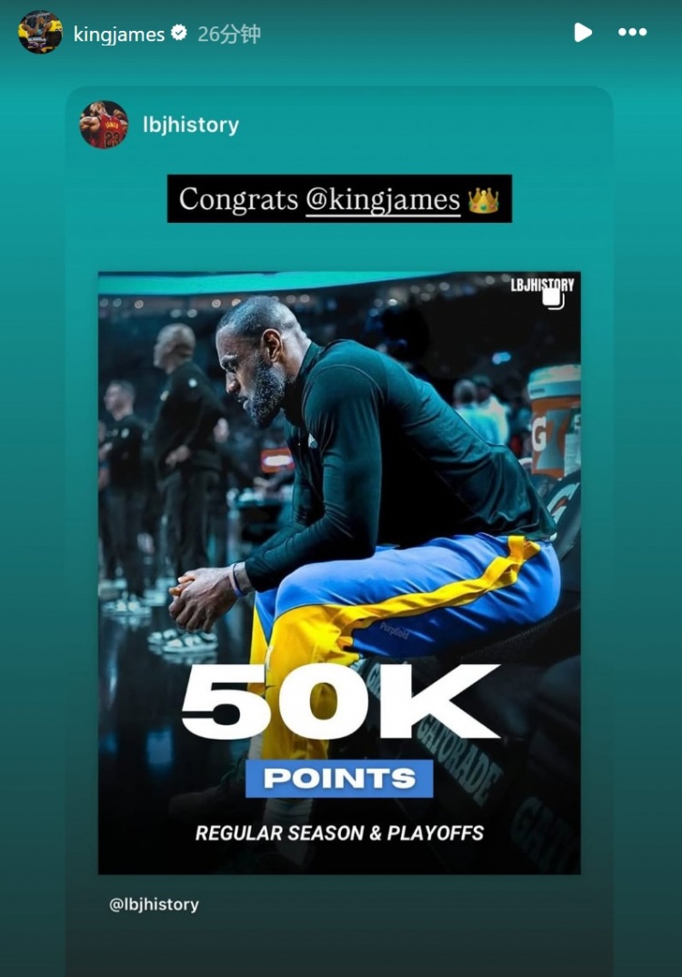 在本场比赛中,詹姆斯生涯总得分突破50000大关;赛后,他转发了众多给自己送祝福的动态。