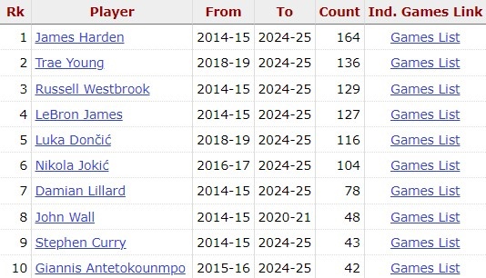 哈登过去10年里165场比赛至少25分10助 同期所有球员中最多