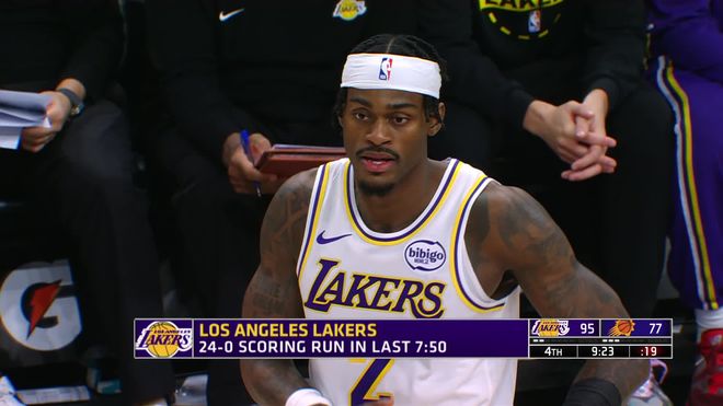 布克和马威在第三节开始后不久轮流得分,太阳队再次领跑。东契奇三罚追近,布克回敬4分稳住局势,可太阳队之后进攻失准,连续投篮打铁,东契奇独得4分率队打出15-0的反击高潮结束第三节,湖人队以86-77领先9分。
