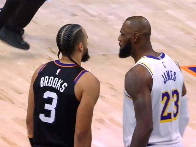 末节开局,詹姆斯上篮与三分连续得分,湖人还接连罚中4球,一波9-0攻势扩大18分优势打停太阳,湖人从第三节后半段开始已经打出24-0攻势。阿伦两罚全中打破太阳得分荒,湖人连得4分扩大99-79领先20分优势,太阳连追5分。范德比尔特三分命中,太阳一波9-0攻势追到差9分,艾顿与马威一度发生争吵。湖人连得4分巩固局势,布克两罚全中,东契奇三分扩大109-95打停太阳。布克两罚全中,艾顿抛射继续维持14分优势,太阳多点开花一波12-0攻势追到仅差2分,詹姆斯关键上篮命中。阿伦两罚全中,斯马特被邓恩封盖,布克三分不中后抢到篮板,并助攻狄龙命中反超三分,但狄龙随后起身撞詹姆斯吃到第二次技术犯规被驱逐,詹姆斯扳平罚球不中。詹姆斯造布克三分打手犯规,太阳挑战失败,詹姆斯三罚两中准绝杀,阿伦关键一攻被詹姆斯封盖。斯马特被犯规继续罚球扩大优势,最终湖人险胜太阳。