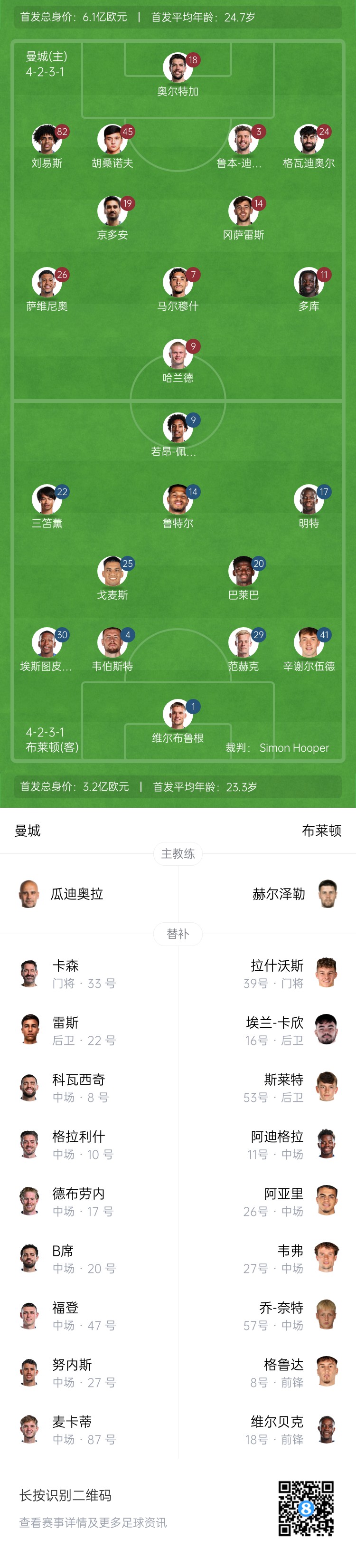 曼城vs布莱顿首发:哈兰德PK三笘薰,刘易斯、京多安出战