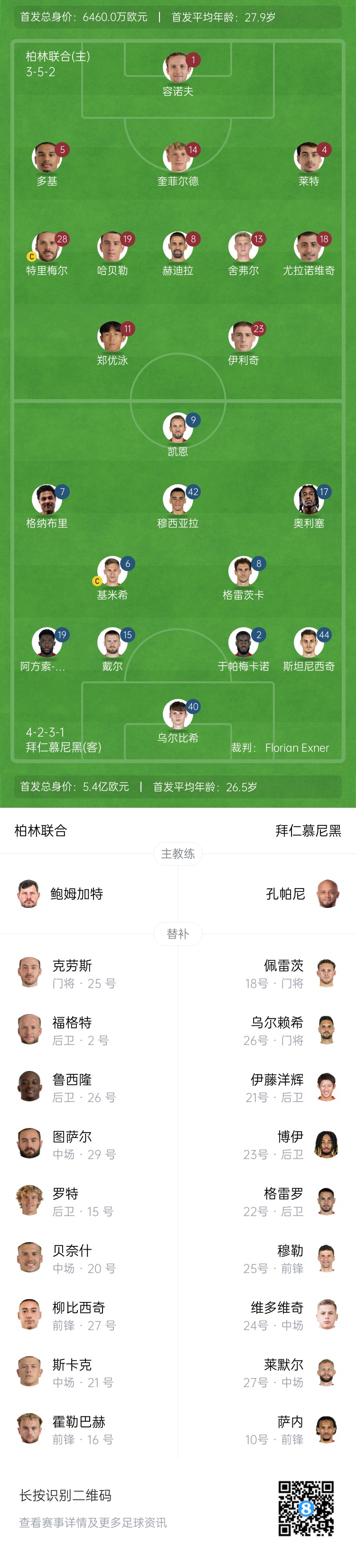 柏林联合首发:1-容诺夫、4-莱特、5-多基、14-奎菲尔德、18-尤拉诺维奇、8-拉尼-赫迪拉、13-舍费尔、11-郑优泳、19-哈贝勒、28-特里梅尔、23-伊利奇