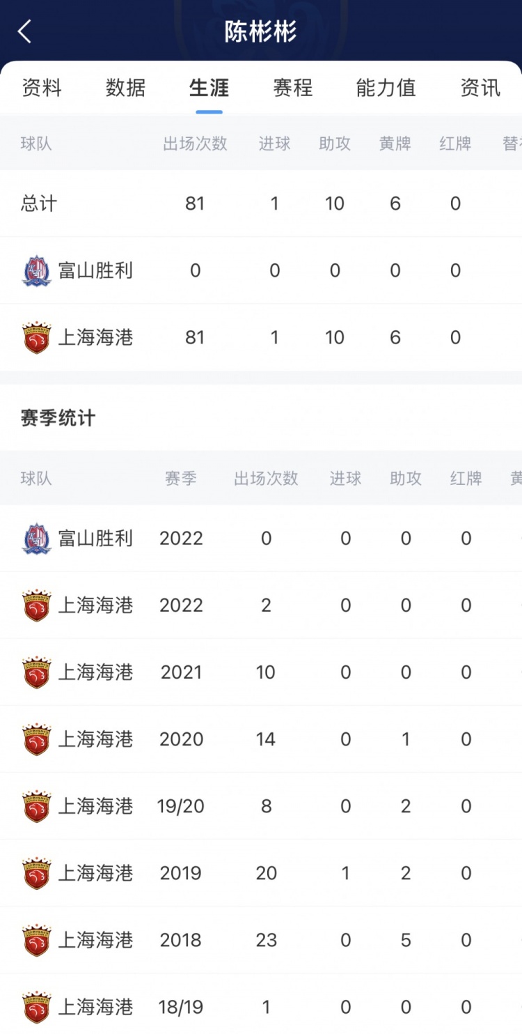 陈彬彬出生于1998年,今年6月将满27岁,场上司职左前卫和左翼卫。此前他在上海海港(上港)效力多年,也曾到日本J3联赛留洋。上赛季结束后,陈彬彬离开海港,随后加盟南通支云。