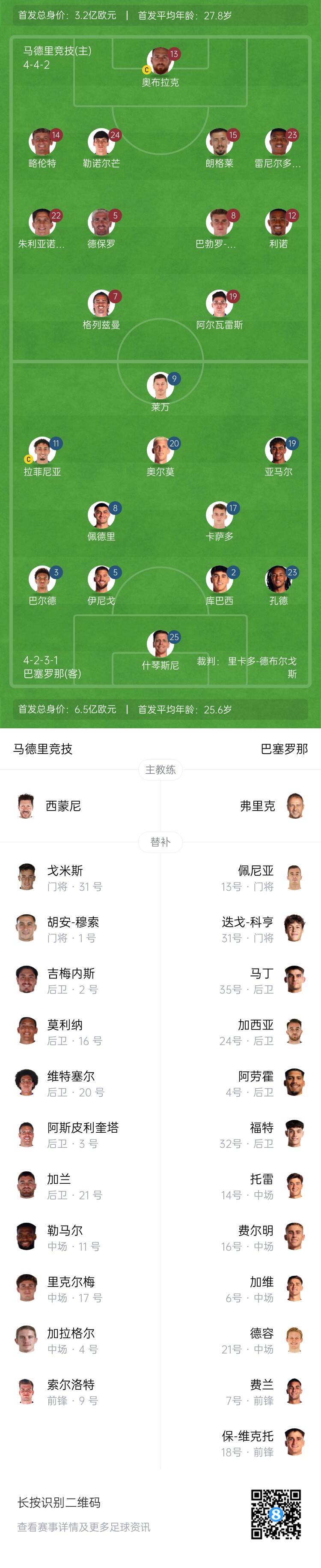 马竞vs巴萨首发:小蜘蛛、格列兹曼先发,莱万、亚马尔出战