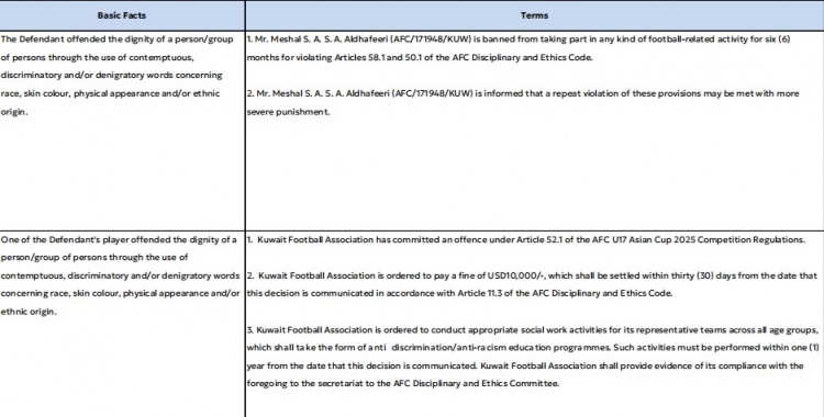 另外,科威特足协被勒令罚款1万美元,罚款必须在30日内付清。亚足联还要求科威特足协对其所有年龄段代表队展开反种族歧视教育。