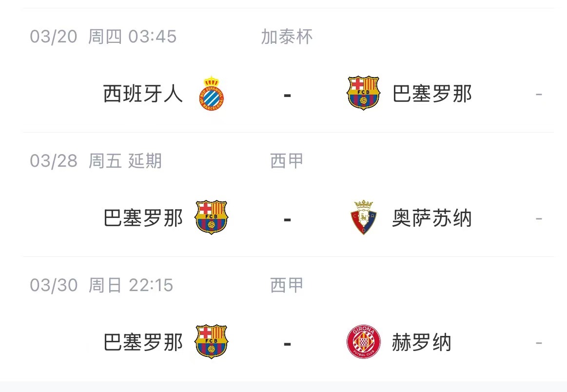 03月17日讯 西足协官方今日发布公告,此前因巴萨队医去世推迟的巴萨vs奥萨苏纳的比赛,将于3月27日进行补赛。