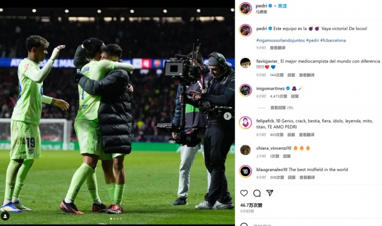 佩德里也晒出自己和队友的相拥庆祝照,并配文:“这支球队????????(状态火爆),多么棒的胜利!太疯狂了!”
