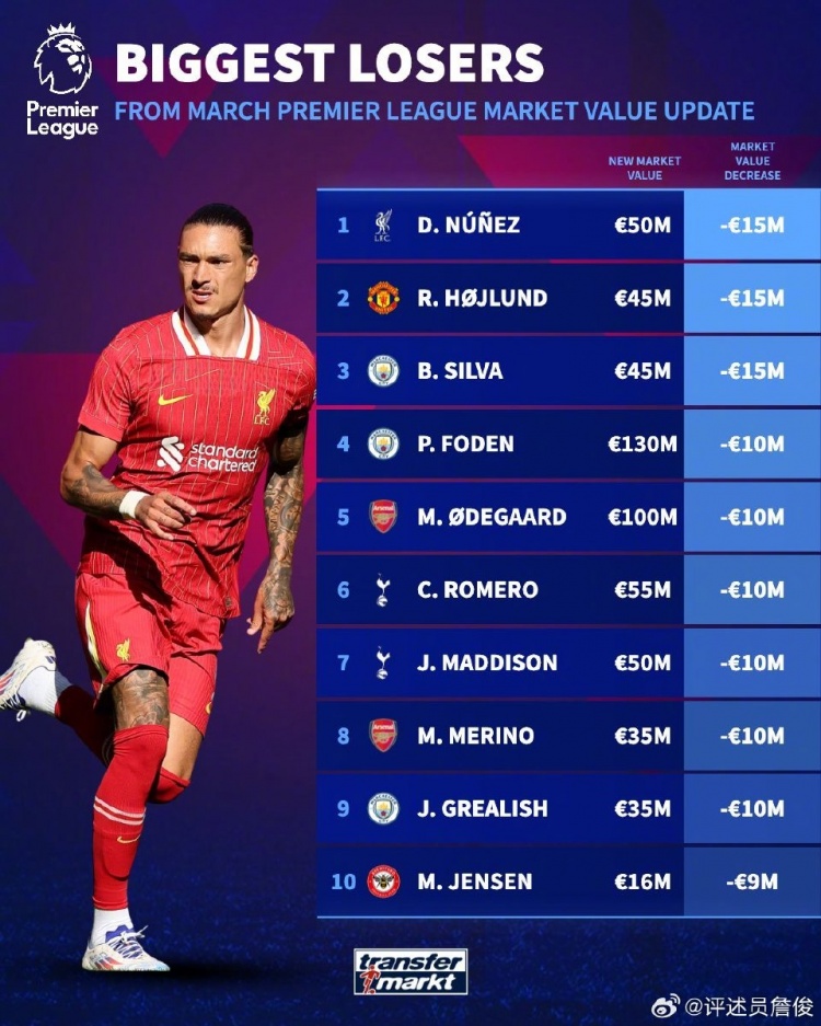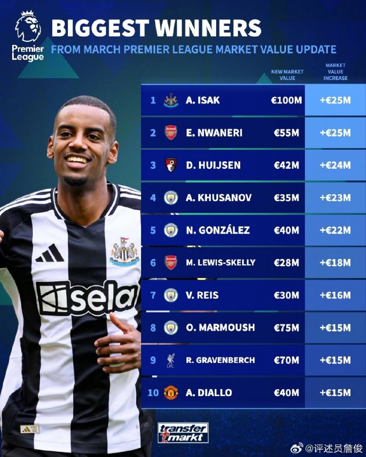 球员身价涨幅方面,伊萨克、恩瓦内利以2500万欧的涨幅并列最多;跌幅方面,努涅斯、霍伊伦、B席均下跌1500万欧并列最多,枪手中场梅里诺下跌1000万欧,并列排第4位。