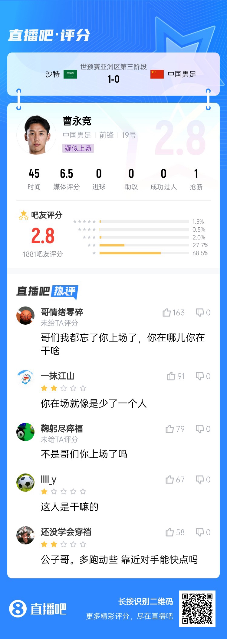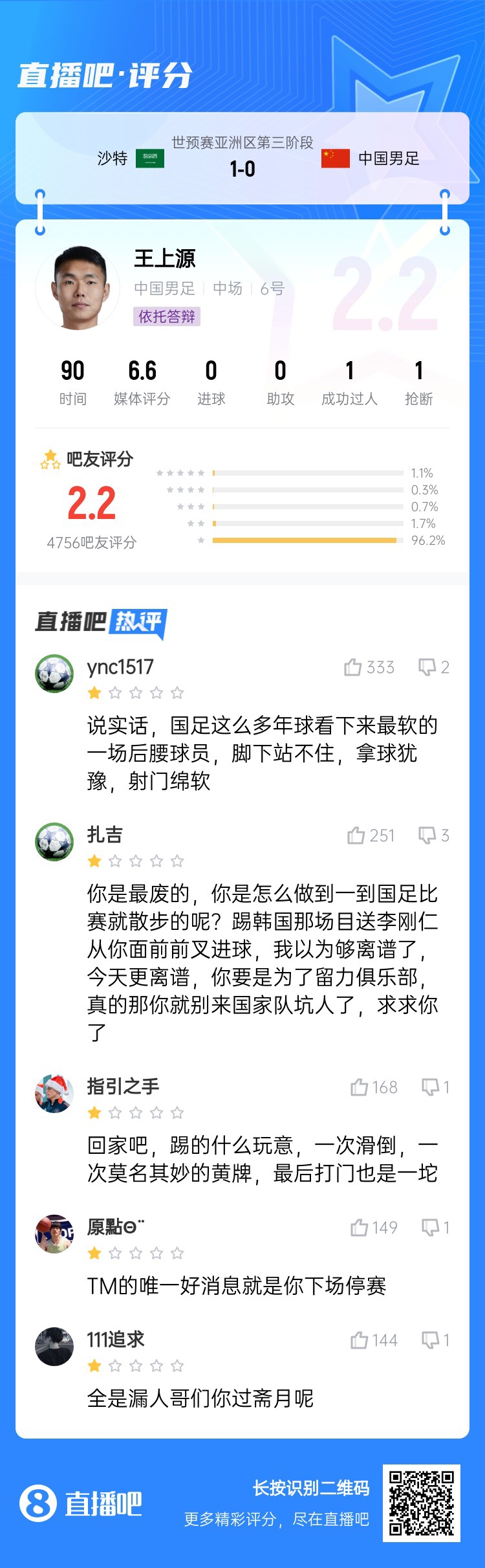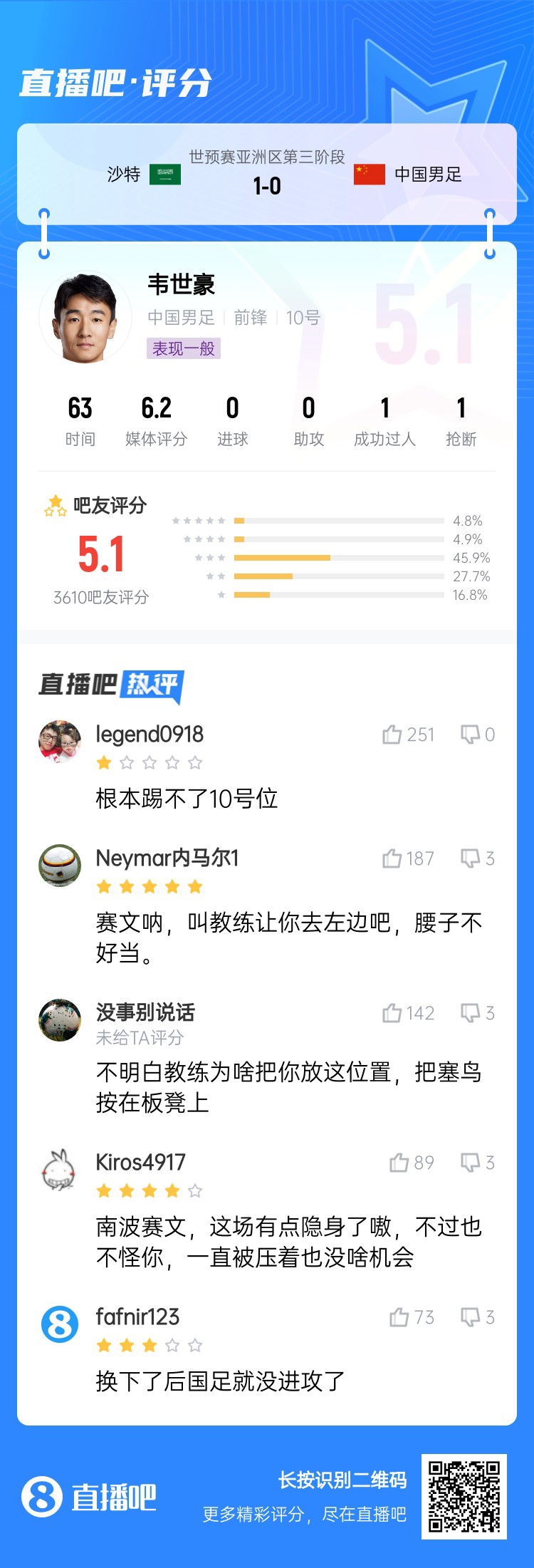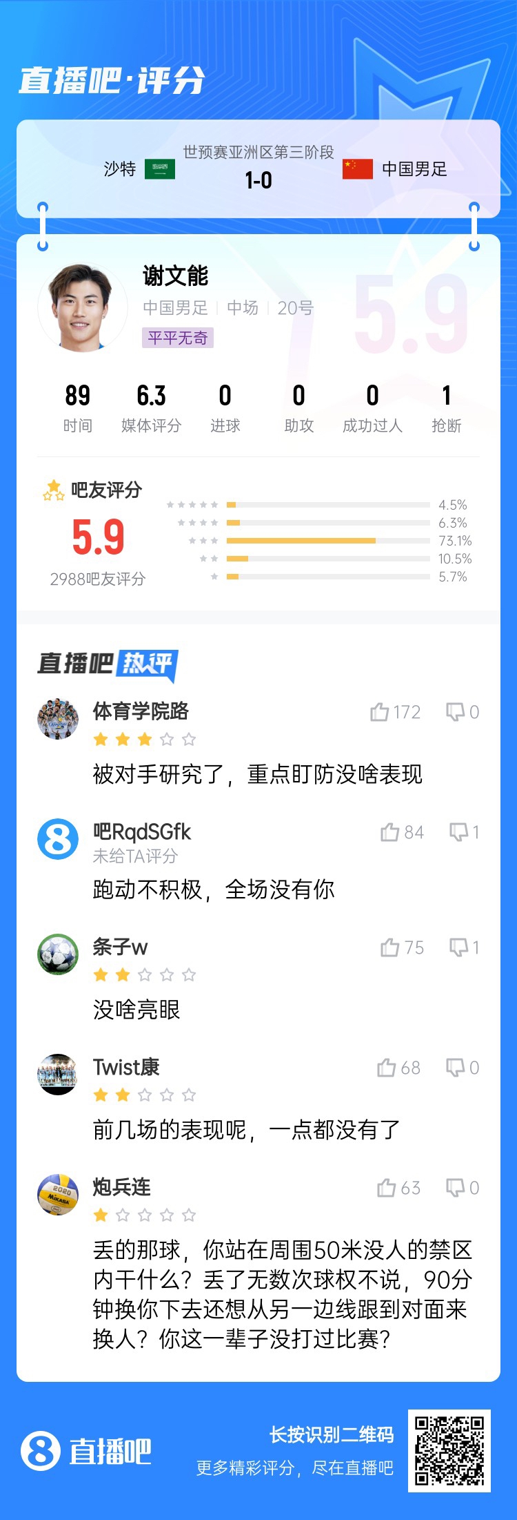 18强赛关键战,国足0-1不敌沙特,没能摆脱小组垫底。吧友评分中,国足中场球员普遍低分,韦世豪5.1分,王上源2.2分,曹永竞2.8分,谢文能5.9分。