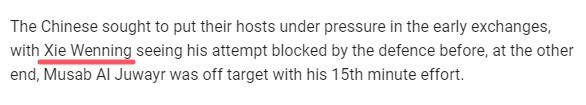 谢文“宁”是谁?亚足联战报中将Xie Wenneng写为Xie Wenning