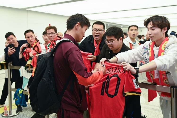 国足于北京时间21日18点40分抵达杭州,机场有众多球迷前来接机,国足众将们也满足了一些球迷签名和合影的请求。