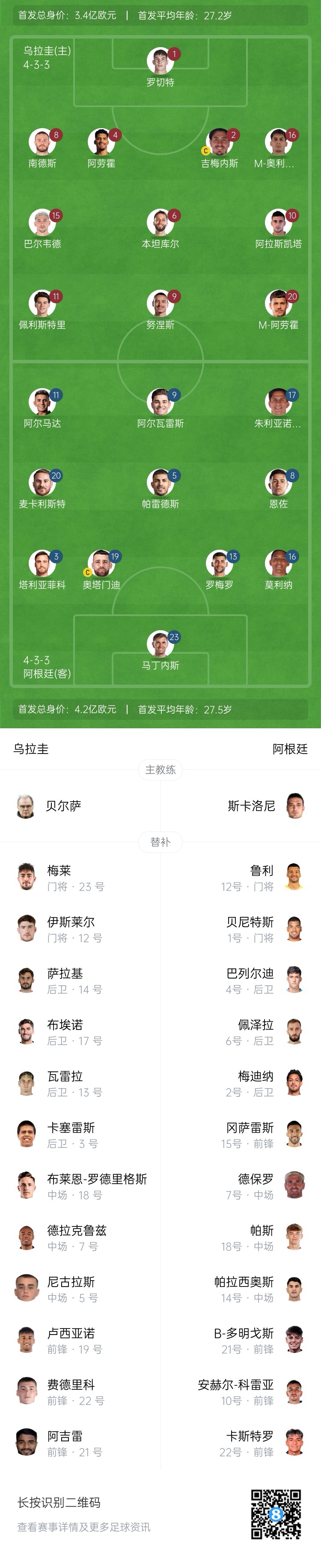 阿根廷vs乌拉圭首发:小蜘蛛PK努涅斯,巴尔韦德、恩佐先发