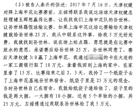 网传秦升供述:拎纸袋子去了申花基地孙世林宿舍,里面是25万现金