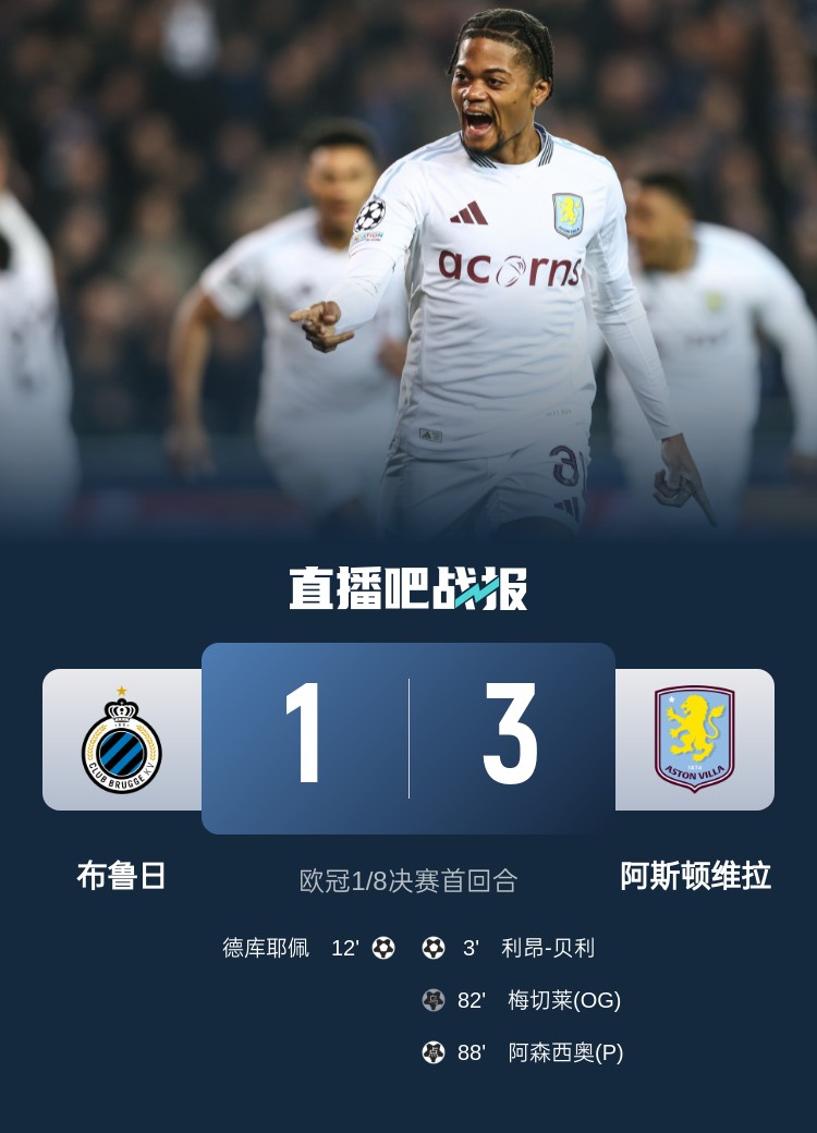 欧冠1/8决赛首回合,维拉3-1布鲁日占先机。上半场,明斯助攻贝利闪击得手,德克伊珀推射扳平;下半场,阿森西奥替补造险,措利斯失单刀,罗杰斯造梅切勒乌龙,卡什造点阿森西奥点射扩大比分。
