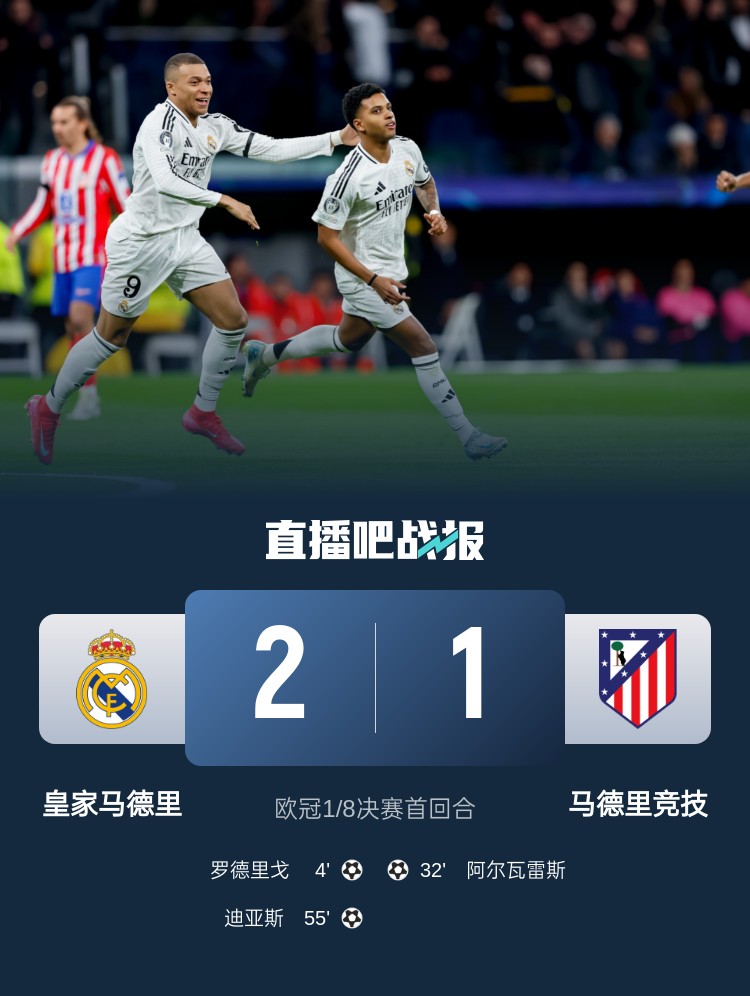 欧冠1/8决赛首回合,皇马2-1马竞,占据晋级先机。上半场,巴尔韦德助攻罗德里戈内切摆脱防守破门,阿尔瓦雷斯过掉卡马文加后世界波扳平;下半场,卜拉欣-迪亚斯禁区内蝴蝶穿花步过人后建功。