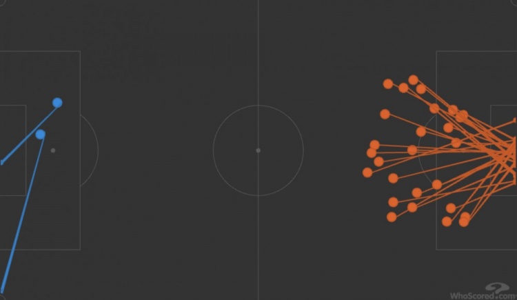 在whoscored统计的射门图上,利物浦唯一的射正就进球了,另一脚踢向了角旗;巴黎的射门则是密密麻麻……