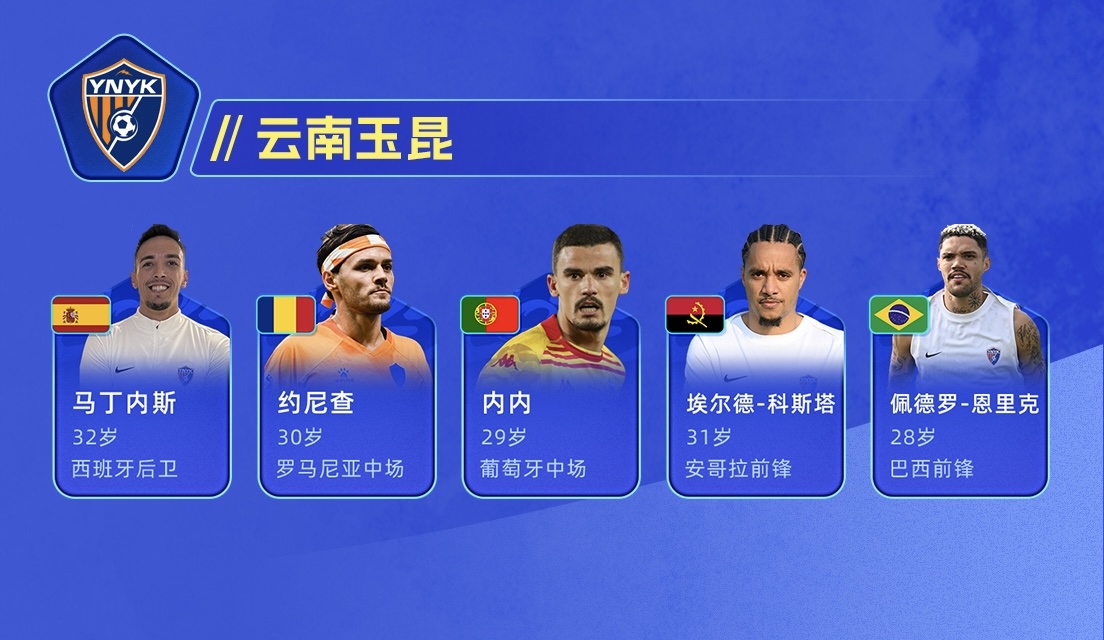 目前云南玉昆的外援有马丁内斯、约尼查、内内、佩德罗-恩里克以及埃尔德-科斯塔,其中马丁内斯、约尼查、内内、佩德罗-恩里克,四人都代表云南玉昆参加了前两轮中超比赛,只有埃尔德-科斯塔还未出场。