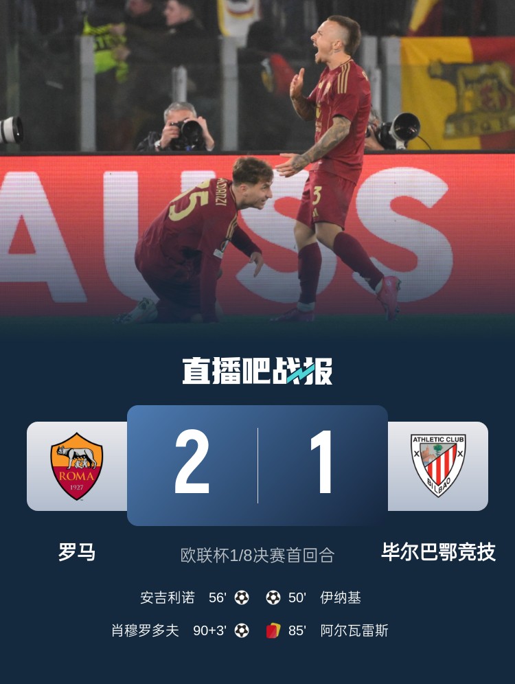 03月07日讯 欧联杯1/8决赛首回合,罗马主场2-1读秒绝杀毕尔巴鄂竞技,占得先机。