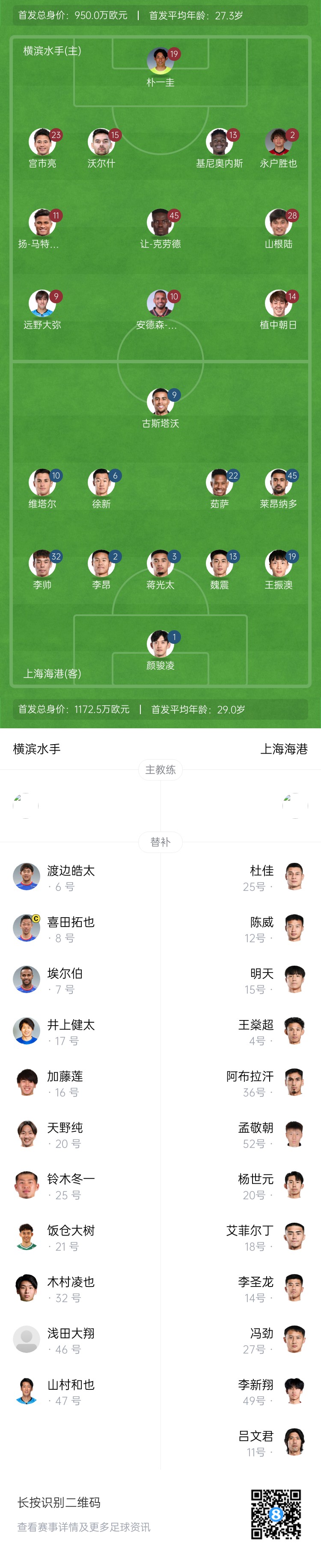 横滨水手首发:19-朴一圭、2-永户胜也、29-杰伊森-基尼奥内斯(F)、48-桑迪-沃尔什(F)、28-山根陆、45-让-克劳德(F)、14-植中朝日、23-宫市亮、40-远野大弥、10-安德森-洛佩斯(F)、11-扬-马特乌斯(F)