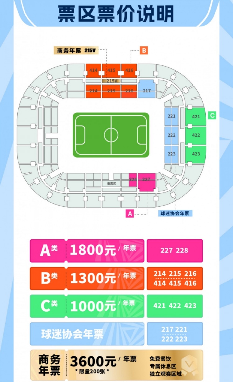 本次年票销售,分为商务年票和看台年票,其中商务年票的价格为3600元,限量200张;看台年票共分为三档,价格分别为1000元、1300元和1800元。