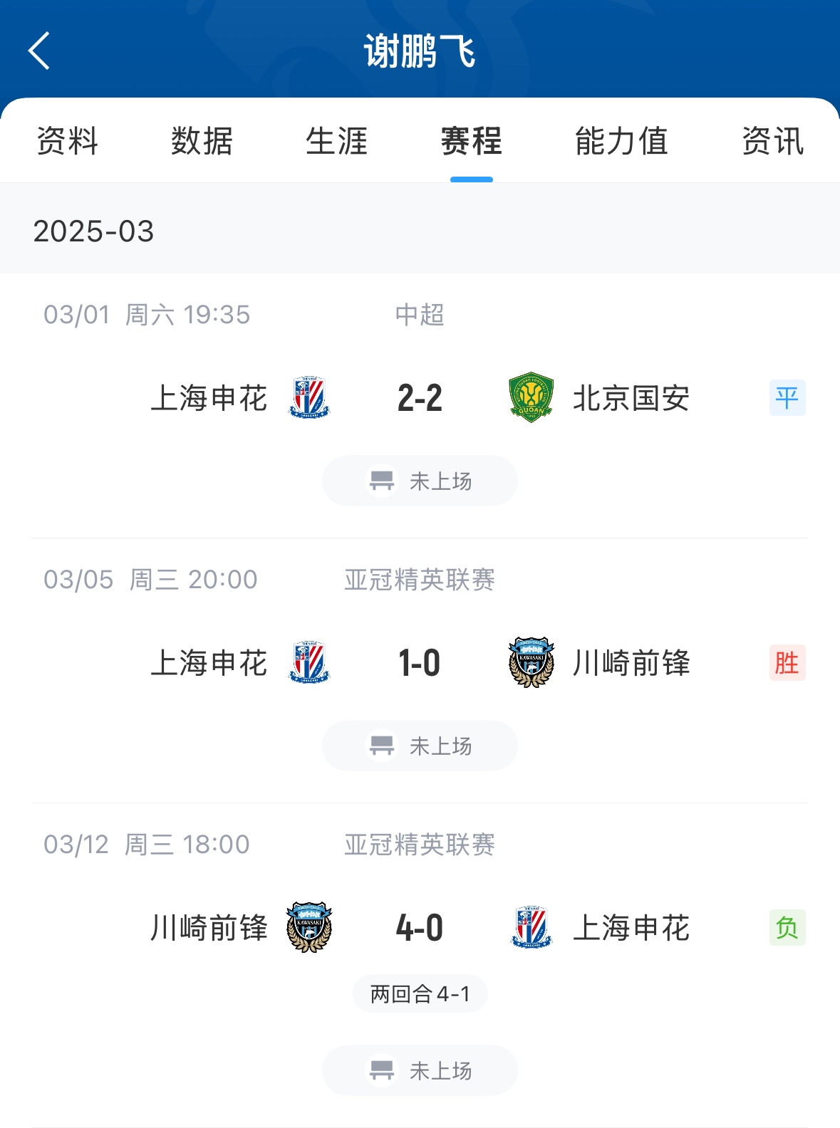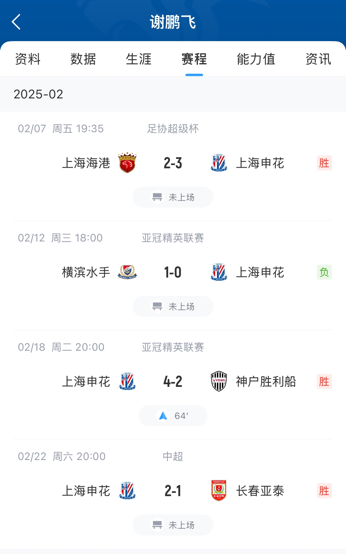 谢鹏飞本场比赛替补未出场,谢鹏飞今年6月底满32岁,本赛季目前代表申花只出场1次出场时间26分钟,其余几场比赛均未出场。