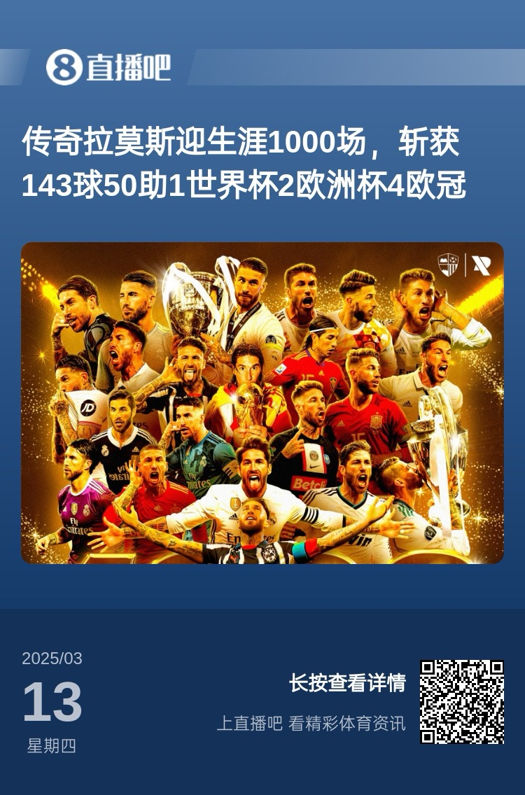 相关阅读:传奇????拉莫斯迎生涯1000场,斩获143球50助1世界杯2欧洲杯4欧冠