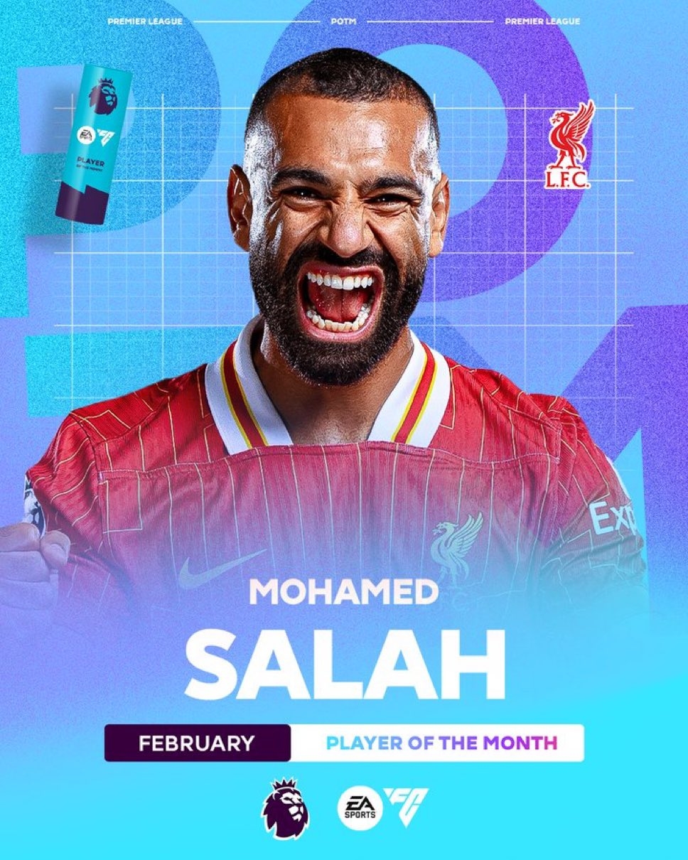7次获奖平纪录!官方:萨拉赫当选英超2月最佳球员,2月6场6球4助